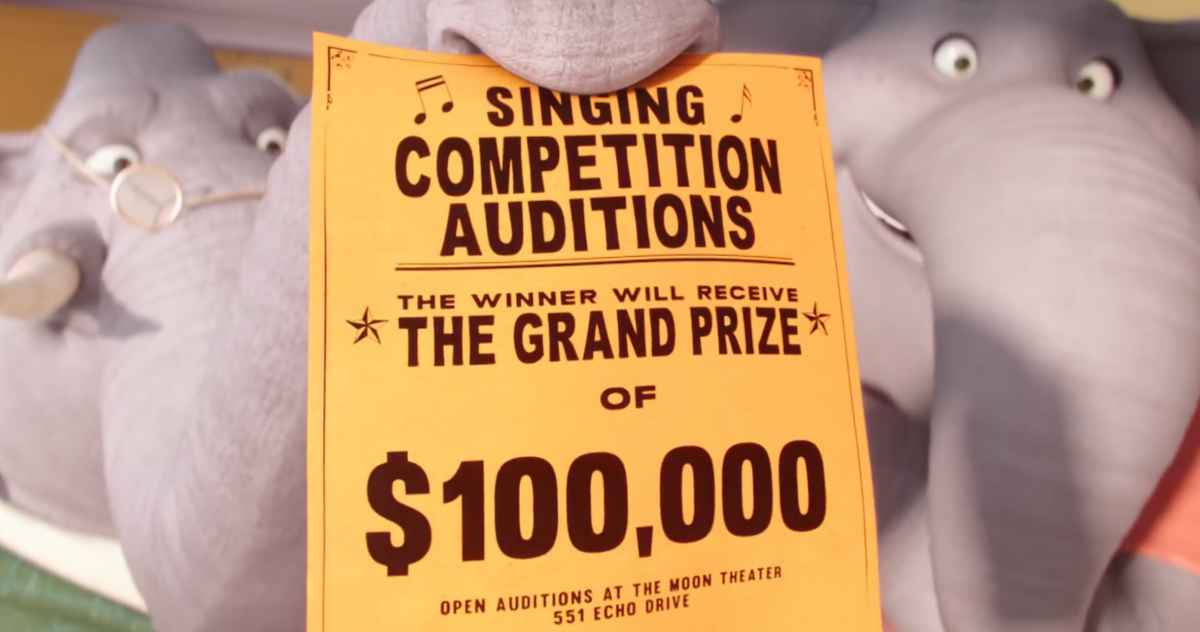 노래 대회 전단지가 뿌려지자마자, 초대박이 났다. 오디션 소식이 알려지자 마자, 전국 방방곡곡에서 끼와 재능으로 똘똘 뭉친 동물들이 노래자랑 오디션에 참가하기 위해 구름떼처럼 몰려든다. 버스터 문은 일사천리 오디션으로 추리고, 또 추려서 최종 라인업을 완성한다. 25남매를 둔 슈퍼 맘 돼지 ‘로지타’부터 록스타를 꿈꾸는 걸크러쉬 고슴도치 ‘애쉬’, 은행 강도단 고릴라 ‘조니’, 무대 공포증을 가진 파워 성량 코끼리 ‘미나’ 까지! 각양각색의 개성과 매력을 가졌지만, 어딘가 2% 씩은 모자라 보이는 후보자들이 최종 본선에 오르게 된다.