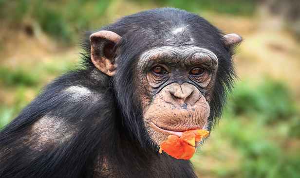 문명과 지적 수준 빼고는 참 인간과 비슷한, 사람과에 속하는 유인원 침팬지. 약 98.8%, 사람의 유전자 정보와 일치한다. 몸 전체가 시커먼 털로 뒤덮여 있어 다소 어두침침해 보이지만, 동그란 뜬 두 눈과 앙다문 일(-)자 입술이 귀욤미를 유발한다. “고놈 생긴 거 한 번 참 순하게 생겼다”고 할 수 있지만, 종종 작은 원숭이를 사냥해 육식을 즐기는, 알고 보면 무서운 녀석이다. 유명한 침팬지 연구자 제인 구달 언니 때문에 사람에게 친근한 이미지라 인간에게 친구 같은 동물이라고 생각하기 쉽다. 그러나 공격적인 본성을 가지고 근육질의 다부진 몸매로 괴력을 발휘하기도 하니 조심해야 한다. 귀엽게 생겼다고 함부로 다가가지도, 악수를 청해서도 안된다. 가장 큰 천적은 표범. 놀랍게도 인간의 전유물이라고 생각했던 도구를 침팬지도 사용할 수 있고, 고기를 먹는다는 사실도 걸 제인 언니가 밝혀냈다. 침팬지는 서식지의 감소와 밀렵, 질병 등의 위협으로 IUCN 적색 목록에 등록된 멸종 위기종이다.